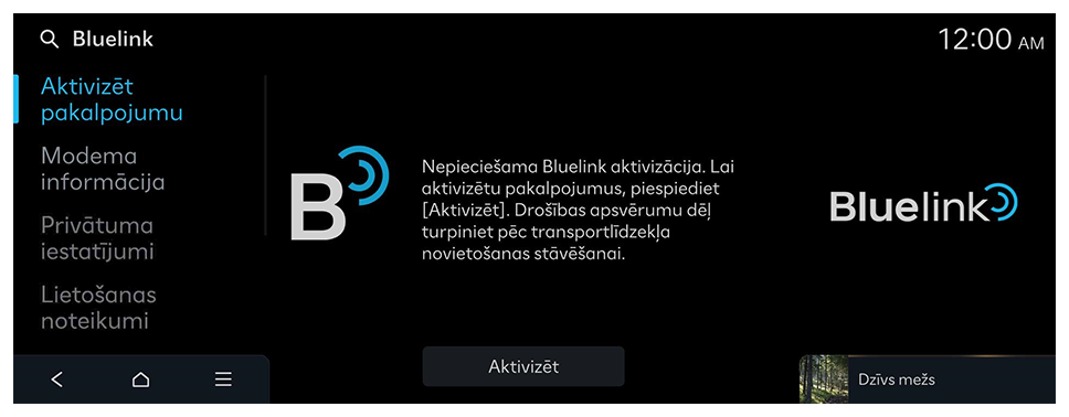 - Sākuma ekrānā pieskarieties pie Iestatījumi ► Bluelink ► Aktivizēt pakalpojumu.