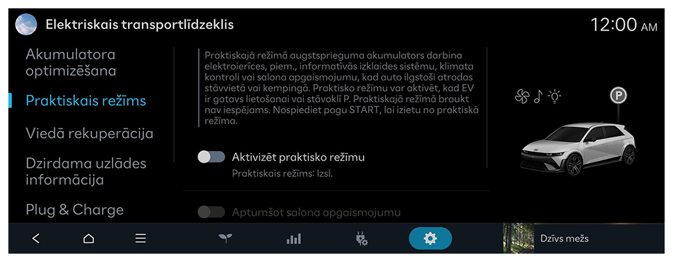 Praktiskajā režīmā augstsprieguma akumulators darbina elektroierīces, piem., informatīvās izklaides sistēmu, klimata kontroli vai salona apgaismojumu, kad auto ilgstoši atrodas stāvvietā vai kempingā.