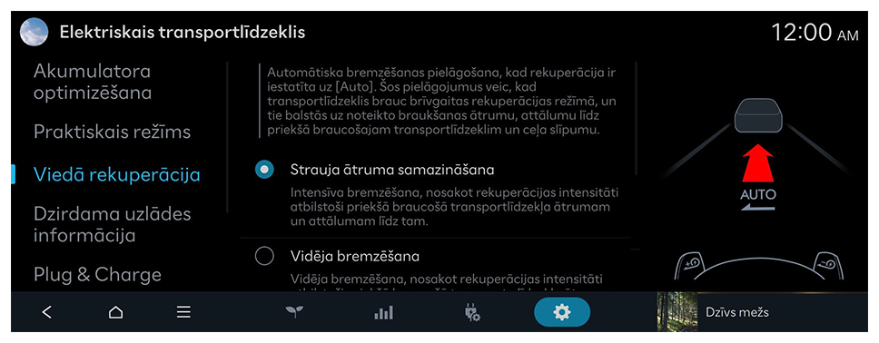 Automātiska bremzēšanas pielāgošana, kad rekuperācija ir iestatīta uz [Auto]. Šos pielāgojumus veic, kad transportlīdzeklis brauc brīvgaitas rekuperācijas režīmā, un tie balstās uz noteikto braukšanas ātrumu, attālumu līdz priekšā braucošajam transportlīdzeklim un ceļa slīpumu.