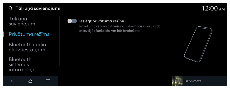 Pārvaldiet Bluetooth ierīces vai konfigurējiet to darbības iestatījumus. Varat arī aktivizēt tālruņa ekrāna projicēšanas funkciju, lai pēc viedtālruņa savienošanas ar sistēmu no sistēmas ekrāna varētu vadīt viedtālruņa lietotni.
