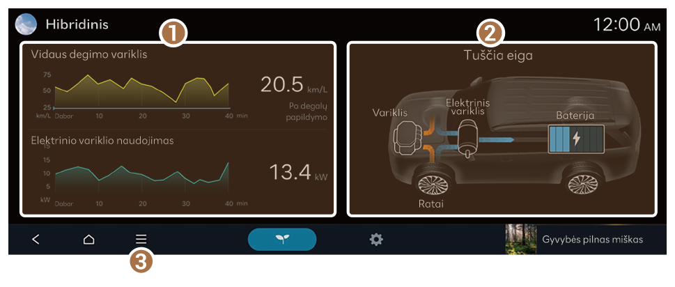 Hibridinio automobilio ekrane matysite toliau pateiktas funkcijas ir informaciją.