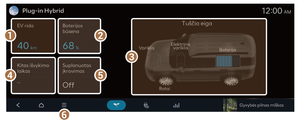 Įkraunamo hibridinio automobilio ekrane matysite toliau pateiktas funkcijas ir informaciją.