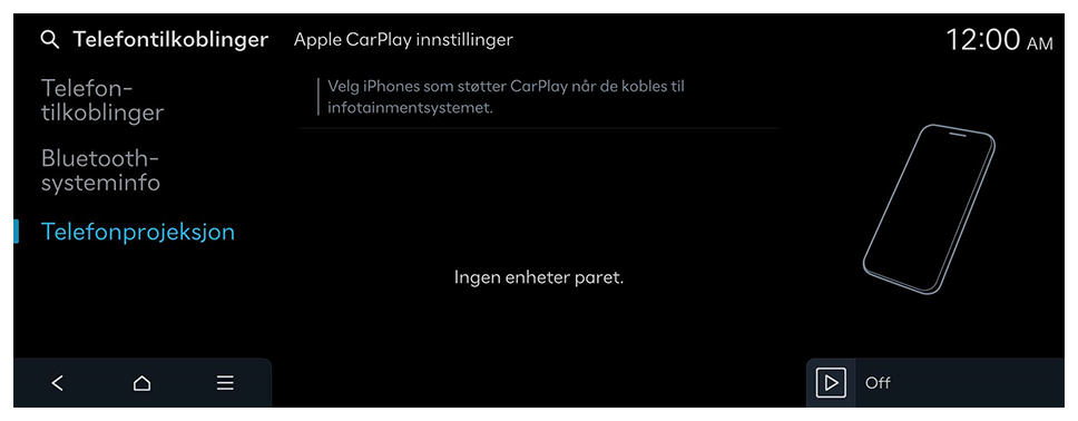 - På startskjermen trykker du på Innstillinger ► Telefontilkoblinger ► Telefonprojeksjon ► Apple CarPlay innstillinger.