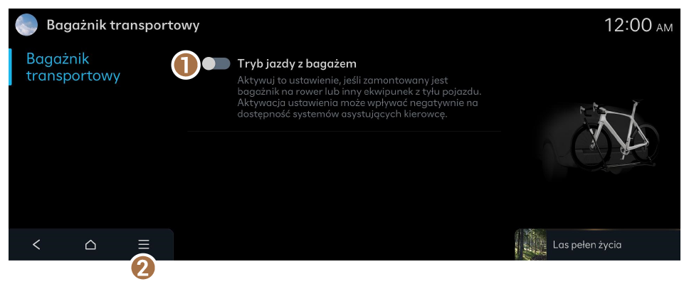 - Aktywuj to ustawienie, jeśli zamontowany jest bagażnik na rower lub inny ekwipunek z tyłu pojazdu. Aktywacja ustawienia może wpływać negatywnie na dostępność systemów asystujących kierowcę.