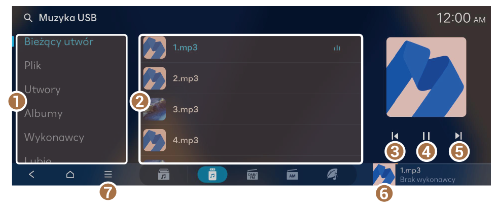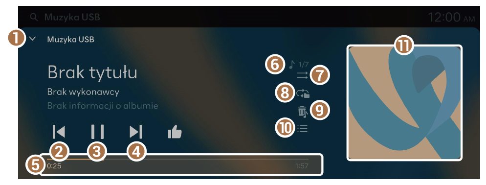 Wyświetla ekran odtwarzacza muzyki z USB.