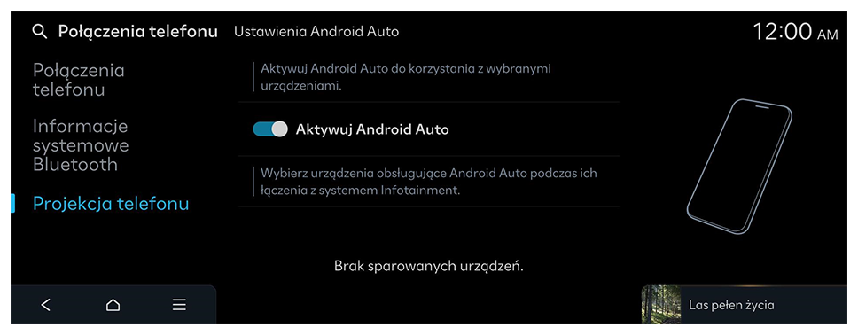 - Na ekranie głównym nacisnąć kolejno Ustawienia ► Połączenia telefonu ► Projekcja telefonu ► Ustawienia Android Auto, a następnie włączyć Aktywuj Android Auto.