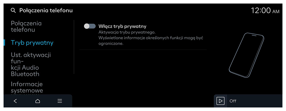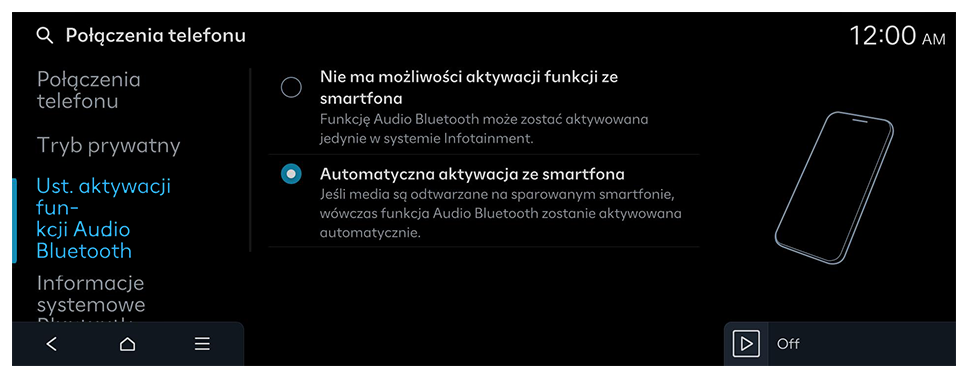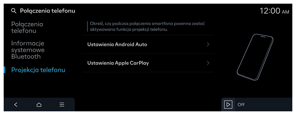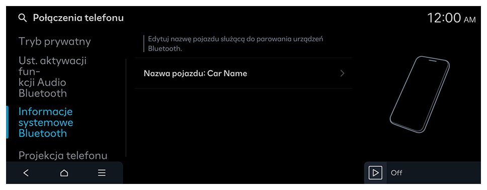 System umożliwia zarządzanie urządzeniami Bluetooth lub konfigurację ustawień ich działania. Można również aktywować funkcję projekcji telefonu, aby po podłączeniu smartfonu do systemu móc sterować aplikacją na smartfonie z poziomu ekranu systemu.