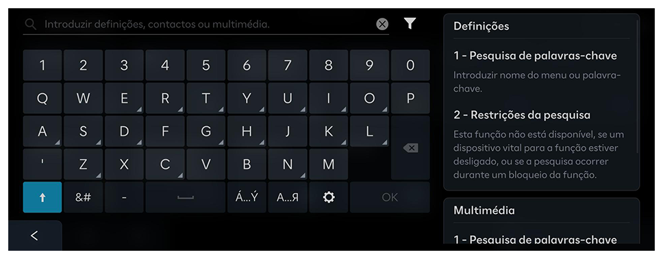 , se o ícone estiver presente no ecrã. - Os resultados da pesquisa são fornecidos sequencialmente, com base na estrutura do menu disponibilizado e na informação, em vários modos.