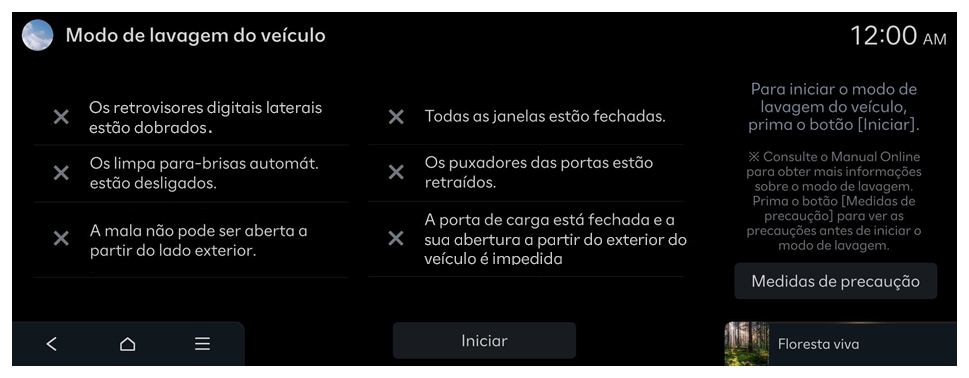 ]. Por exemplo, se o ícone de manobra manual for apresentado em relação ao teto de abrir, verifique este e certifique-se de que não apresenta objetos estranhos antes de dar início à lavagem do automóvel.