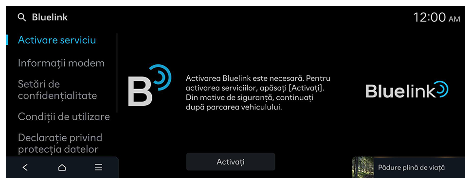 - Pe ecranul principal, apăsați Setări ► Bluelink ► Activare serviciu.