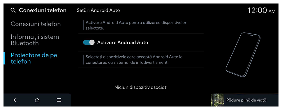 - Pe ecranul principal, apăsați Setări ► Conexiuni telefon ► Proiectare de pe telefon ► Setări Android Auto, apoi activați Activare Android Auto.