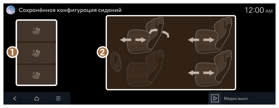 ► Настройки сиденья. - Во время движения невозможно отрегулировать и сохранить положение сиденья или загрузить сохраненное положение сиденья. Сначала остановите автомобиль, а затем измените положение сиденья.