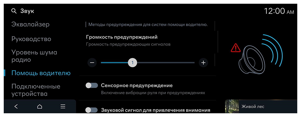 Включение аудиооповещения об удержании полосы. Сигнал предупреждения невозможно отключить, если выключены тактильные предупреждения.