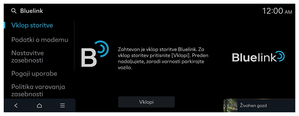 - Na začetnem zaslonu pritisnite Nastavitve ► Bluelink ► Vklop storitve.