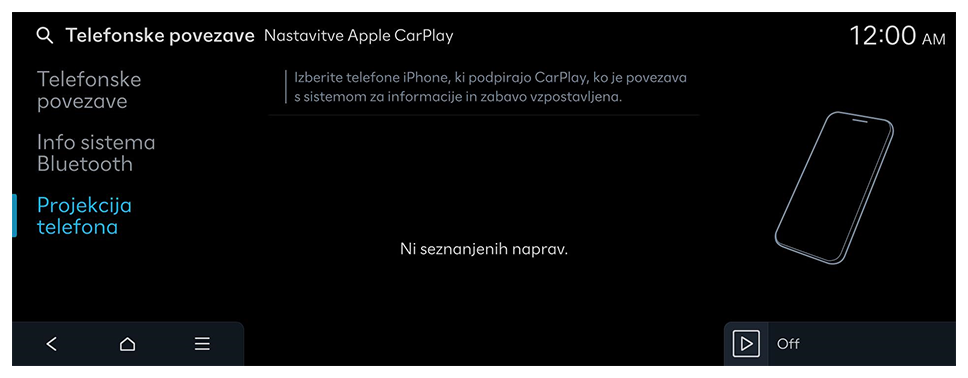 - Na začetnem zaslonu pritisnite Nastavitve ► Telefonske povezave ► Projekcija telefona ► Nastavitve Apple CarPlay.