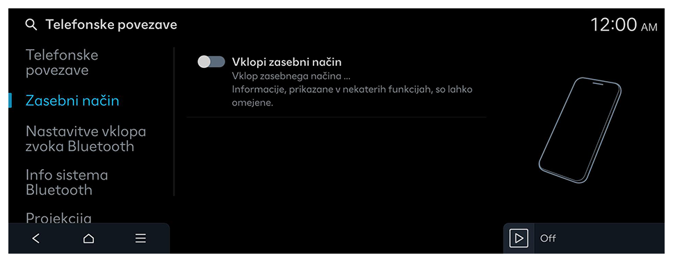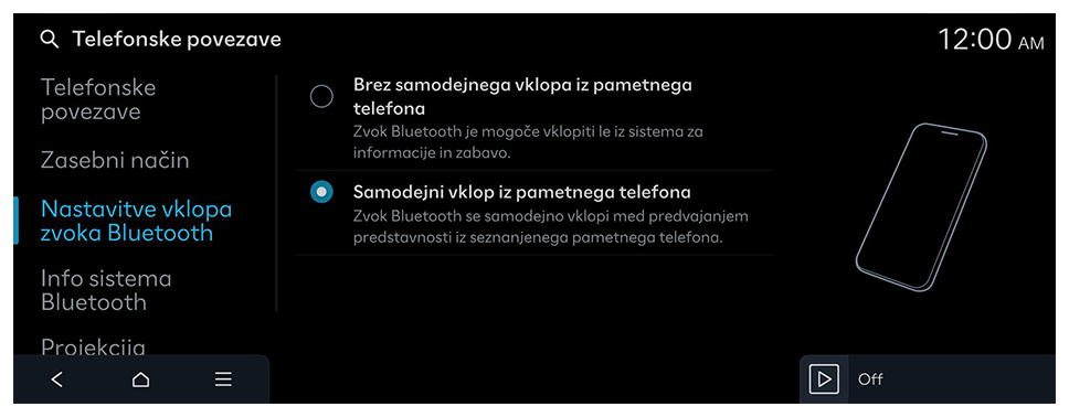 Upravljajte z napravami Bluetooth ali prilagodite njihove nastavitve delovanja. Vklopite lahko tudi projekcijo telefona, da upravljate aplikacijo pametnega telefona na zaslonu sistema po tem, ko pametni telefon povežete v sistem.