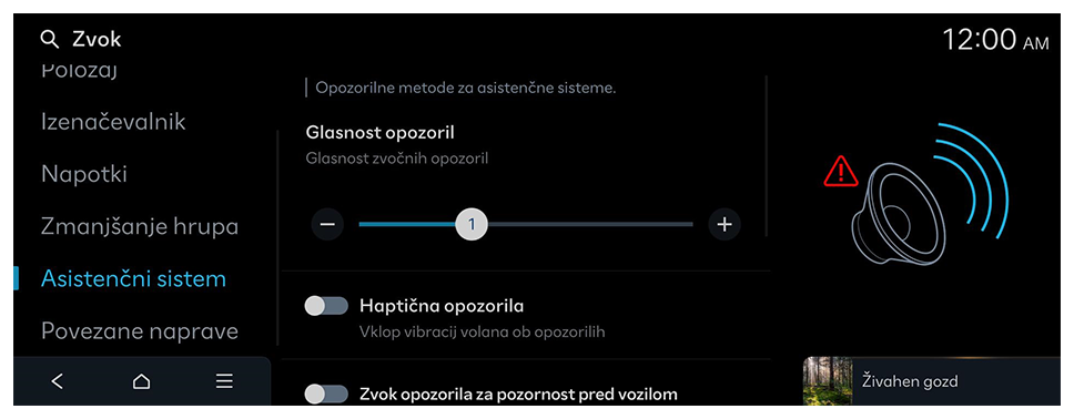 Zvočno opozorilo sistema za varnost voznega pasu je izklopljeno, četudi sta glasnost opozoril in haptični odziv vklopljena.