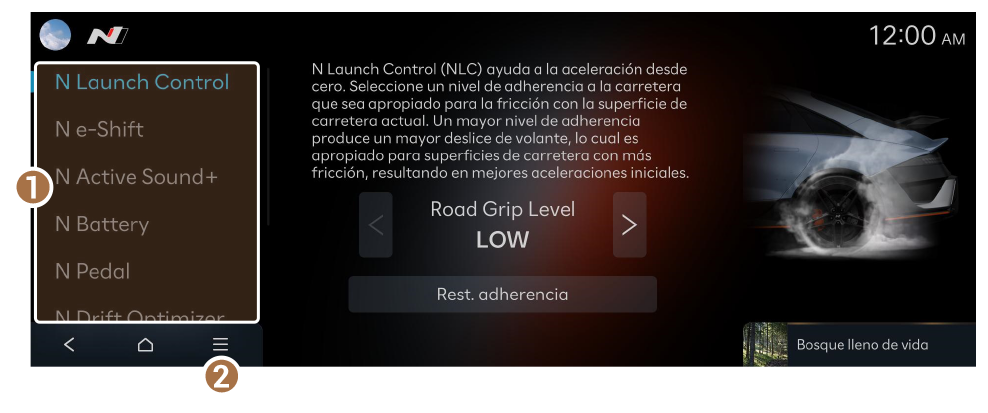 - Tutorial: permite ver los tutoriales sobre conducción en modo N, como el de conducción en pista y económica.