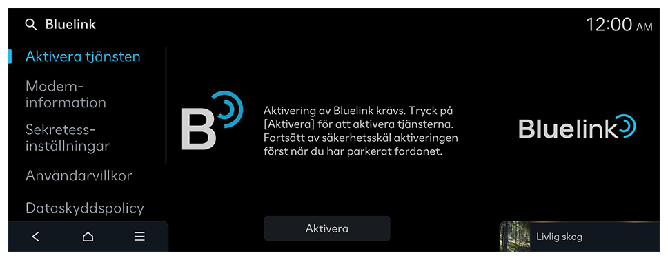 - På hemskärmen trycker du på Inställningar ► Bluelink ► Aktivera tjänsten.