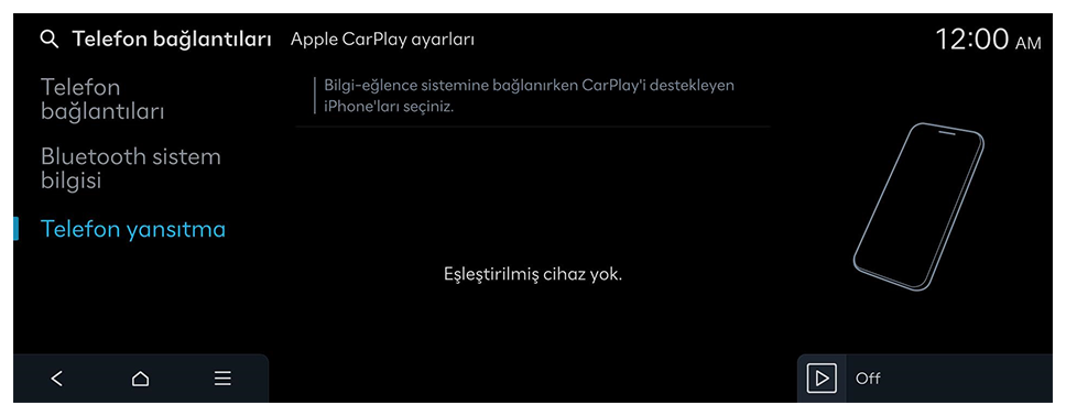 - iPhone başarılı bir şekilde bağlandığında, Ana ekranda Telefon yansıtma Apple CarPlay öğesine geçer. Apple CarPlay görünmezse bağlantıyı tekrar deneyin.