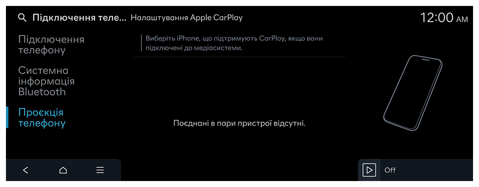 - На головному екрані натисніть Налаштування ► Підключення телефону ► Проєкція телефону ► Налаштування Apple CarPlay.