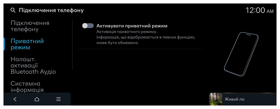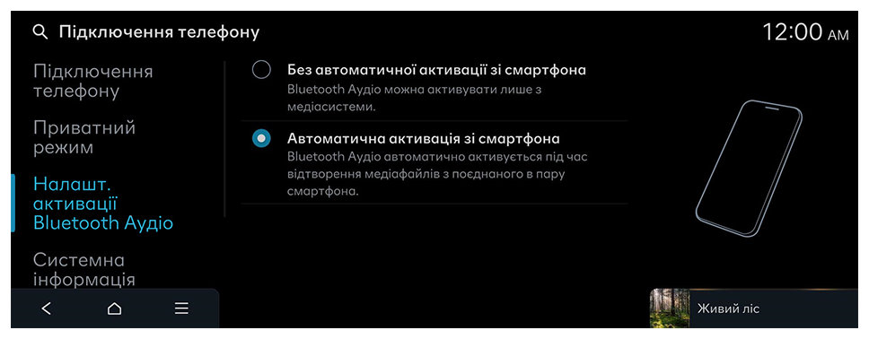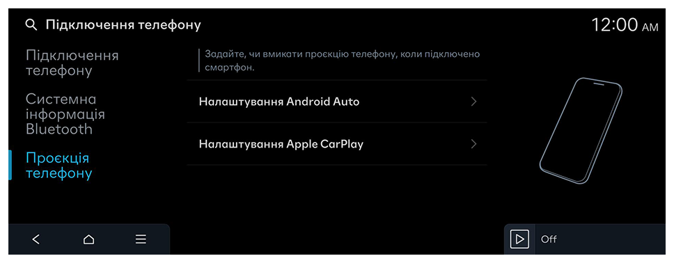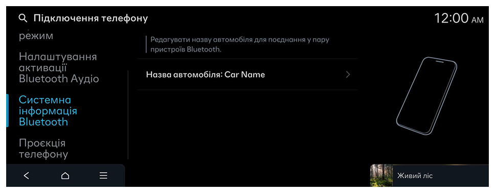 Керуйте пристроями Bluetooth або налаштовуйте їхні параметри роботи. Ви також можете активувати проекцію телефону, щоб керувати програмами смартфону з системного екрана після під’єднання смартфону до системи.