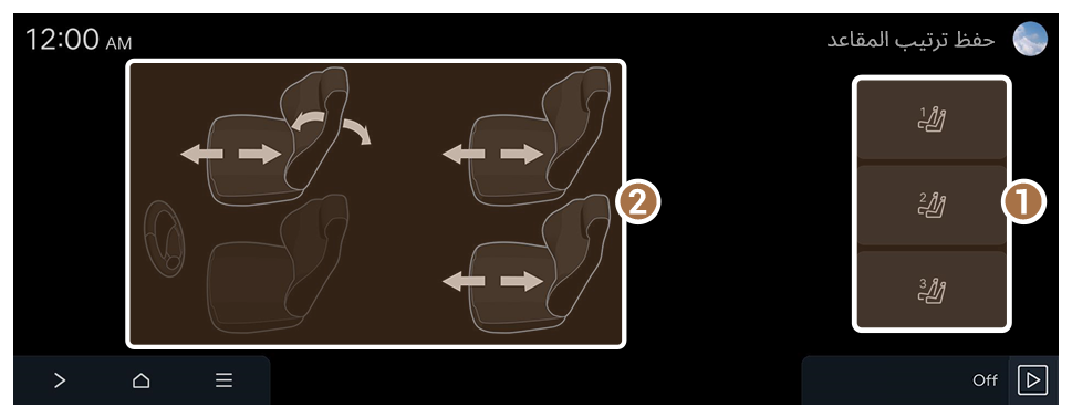 ◄ إعدادات المقعد. - أثناء القيادة، لا يمكن ضبط وضع المقعد وحفظه أو تحميل وضع المقعد المحفوظ. أوقف السيارة أولاً، ثم قم بتغيير وضع المقعد.