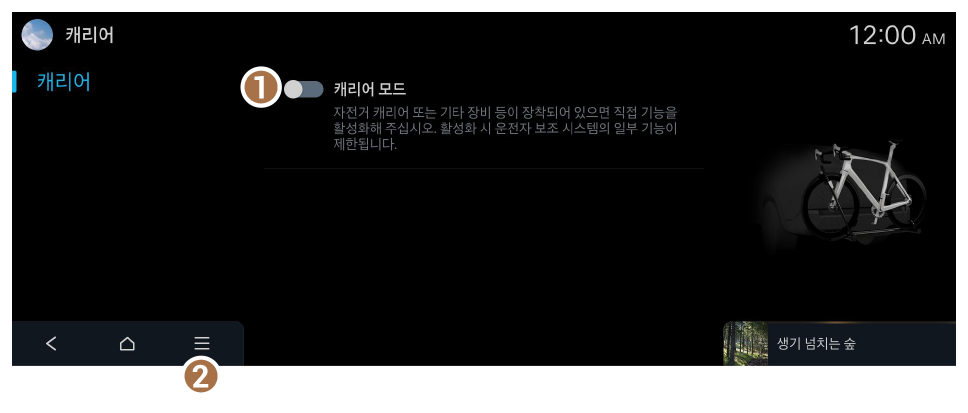 자전거 캐리어 또는 기타 장비 등이 장착되어 있으면 직접 기능을 활성화해 주십시오. 활성화 시 운전자 보조 시스템의 일부 기능이 제한됩니다.