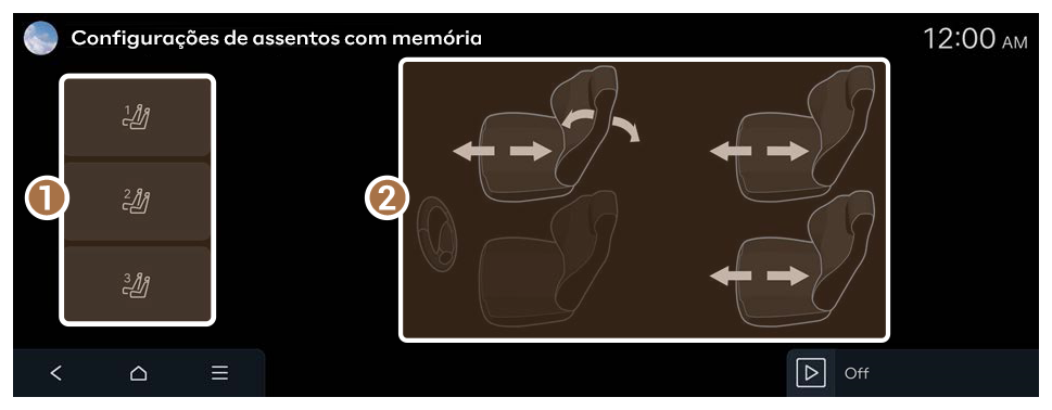 ► Config. assentos. - Durante a condução, não é possível ajustar e salvar uma posição do banco ou carregar uma posição do banco salva. Primeiro, pare o veículo e depois mude a posição do banco.