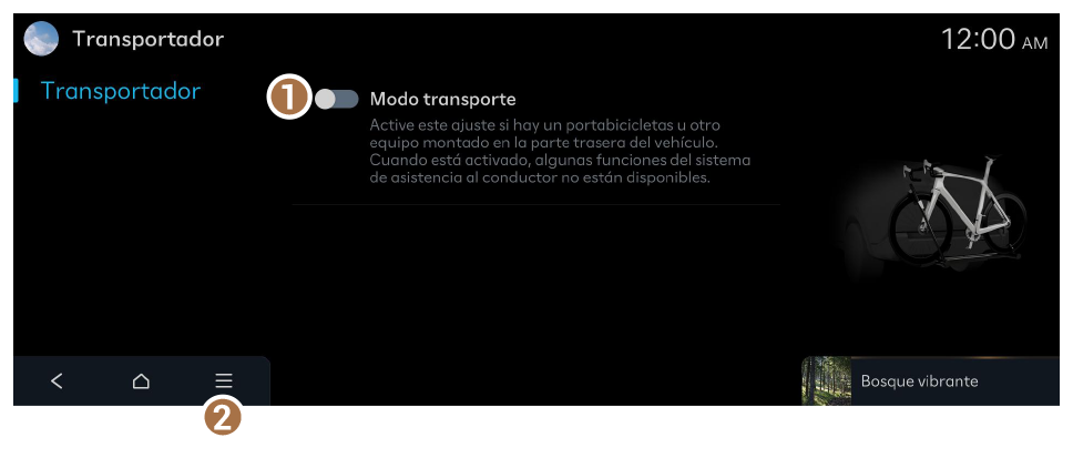 - Active este ajuste si hay un portabicicletas u otro equipo montado en la parte trasera del vehículo. Cuando está activado, algunas funciones del sistema de asistencia al conductor no están disponibles.