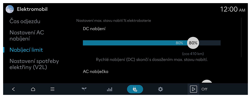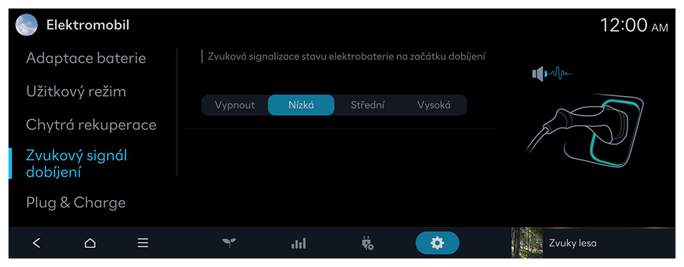 - Zvuková signalizace nabíjení se vypíná stiskem tlačítka Vypnuto.