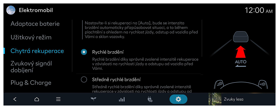 Nastavíte-li si rekuperaci na [Auto], bude se intenzita brzdění automaticky přizpůsobovat situaci, a to během plachtění s ohledem na rychlost jízdy, odstup od vozidla před Vámi a sklon vozovky.