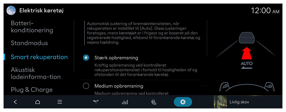 Automatisk justering af bremseintensiteten, når rekuperation er indstillet til [Auto]. Disse justeringer foretages under kørslen og er baseret på den registrerede kørselshastighed, afstand til det forankørende køretøj og vejens hældning.