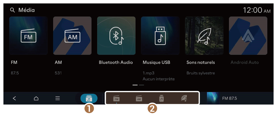 - Affiche l’écran d’accueil Média.