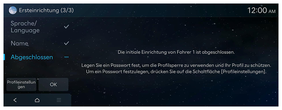 Zum Zugreifen auf den personalisierten Service muss ein Benutzerprofil erstellt werden. Falls noch kein Benutzerprofil erstellt wurde, befolgen Sie die nachstehenden Anweisungen, um ein Benutzerprofil zu erstellen, und synchronisieren Sie es mit Ihrem Bluelink-Konto und Fahrzeugbenutzerkonto, bevor Sie den personalisierten Service verwenden.