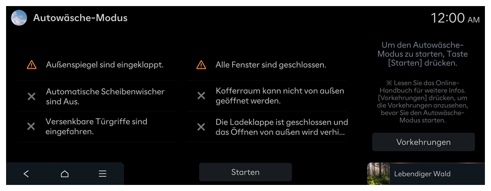 ]. Wenn z. B. das Symbol für die manuelle Betätigung für das Schiebedach angezeigt wird, überprüfen Sie das Schiebedach und stellen Sie sicher, dass keine Objekte den ordnungsgemäßen Betrieb des Schiebedachs behindern, bevor die Autowäsche beginnt.