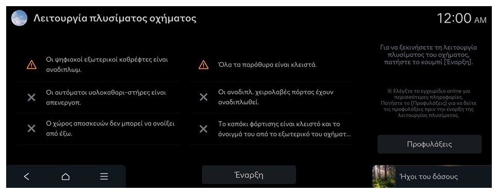 ]. Για παράδειγμα, εάν εμφανίζεται το εικονίδιο μη αυτόματου ελιγμού για την ηλιοροφή, ελέγξτε την ηλιοροφή και βεβαιωθείτε ότι δεν υπάρχουν ξένα αντικείμενα πριν ξεκινήσει το πλύσιμο του οχήματος.