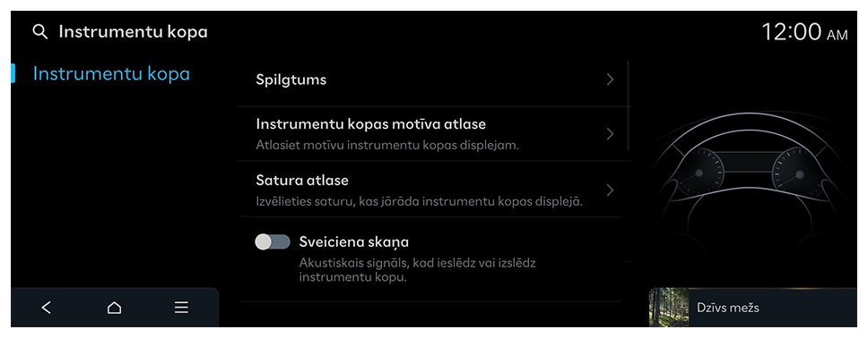 Tiek parādīts instrumentu paneļa iestatījumu ekrāns.