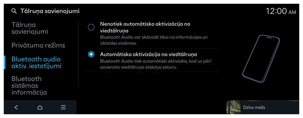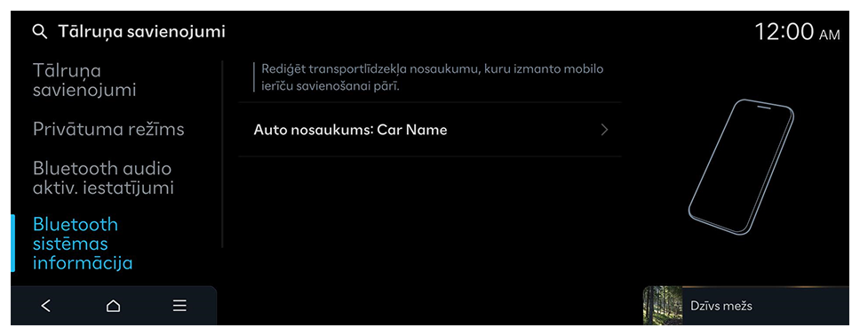 Pārvaldiet Bluetooth ierīces vai konfigurējiet to darbības iestatījumus. Varat arī aktivizēt tālruņa ekrāna projicēšanas funkciju, lai pēc viedtālruņa savienošanas ar sistēmu no sistēmas ekrāna varētu vadīt viedtālruņa lietotni.