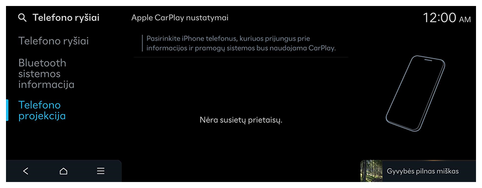 - Sėkmingai prijungus „iPhone“, Telefono projekcija pradžios ekrane persijungs į Apple CarPlay. Jei nematote Apple CarPlay, pabandykite prisijungti dar kartą.
