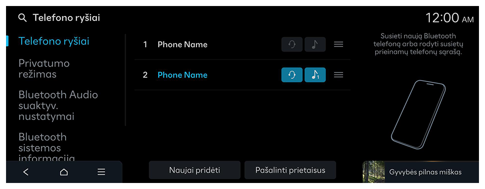 - Kad prisijungtumėte, išmaniajame telefone įjunkite „Wi-Fi“ ir „Bluetooth“, tada ieškomų „Bluetooth“ įrenginių sąraše pasirinkite automobilio sistemą.