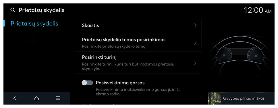 Bus parodytas prietaisų skydelio nustatymų ekranas.