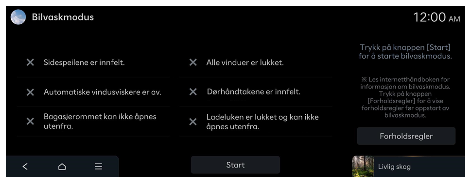 ]. For eksempel, hvis det manuelle manøverikonet vises for soltaket, sjekk soltaket og sørg for at det ikke er fremmedlegemer tilstede før bilvasken starter.