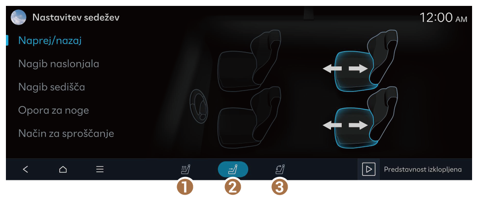 ► Nastavitve sedežev. - Med vožnjo ni mogoče nastaviti in shraniti položaja sedeža ali naložiti shranjenega položaja sedeža. Najprej ustavite vozilo in nato spremenite položaj sedeža.