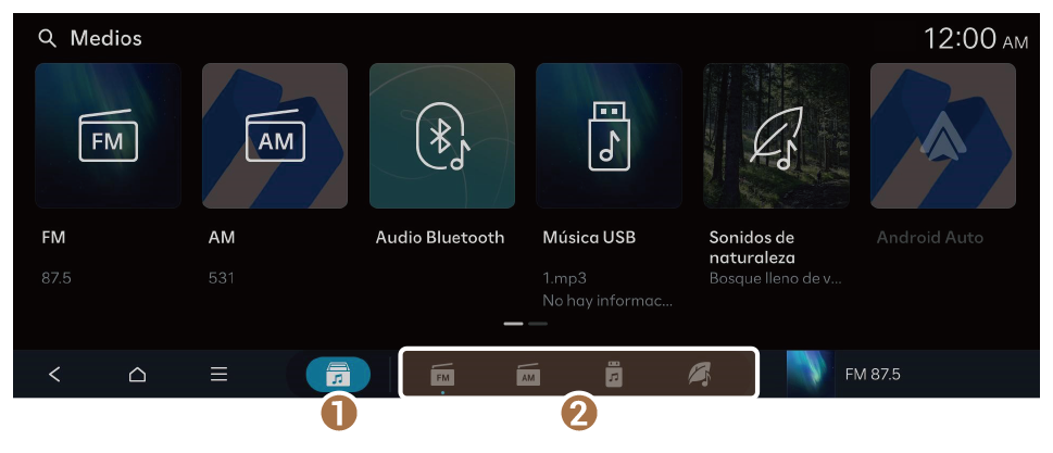 - Muestra la pantalla de inicio de medios.