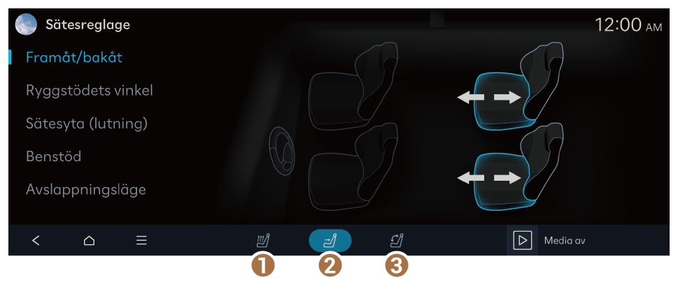► Sätesinställningar. - Under körning är det inte möjligt att justera och spara en sätesposition eller ladda en sparad sätesposition. Stanna först fordonet och ändra sedan en sätesposition.