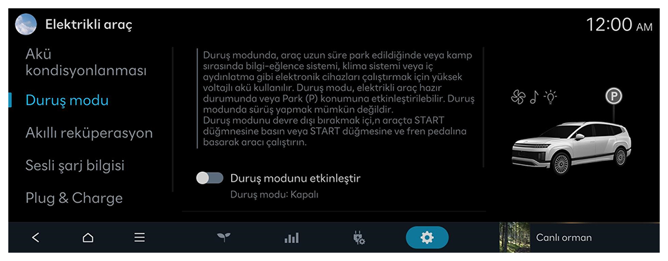 Duruş modunda, araç uzun süre park edildiğinde veya kamp sırasında bilgi-eğlence sistemi, klima sistemi veya iç aydınlatma gibi elektronik cihazları çalıştırmak için yüksek voltajlı akü kullanılır. Duruş modu, elektrikli araç hazır durumunda veya Park (P) konumuna etkinleştirilebilir.