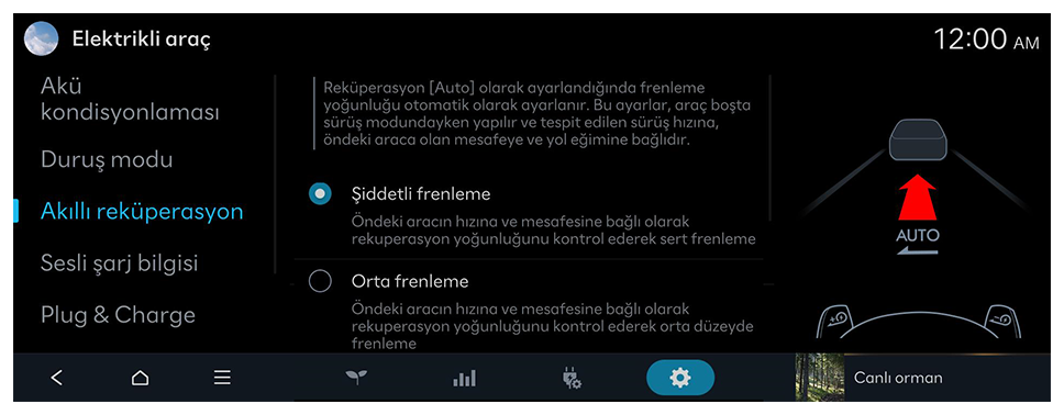 Rekuperasyon [Auto]'ya ayarlandığında frenleme gücü otomatik olarak ayarlanır. Bu ayarlar, seyir modundayken yapılır ve hıza, öndeki araca olan mesafeye ve yol eğimine bağlıdır.