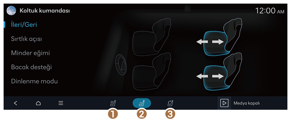 ► Koltuk ayarları öğesine basın. - Sürüş sırasında bir koltuk konumunu ayarlamak ve kaydetmek ya da kayıtlı bir koltuk konumunu yüklemek mümkün değildir. Önce aracı durdurun ve sonra koltuk konumunu değiştirin.